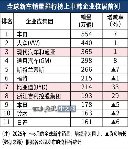 在2025年1~6月的全球新车销售中,韩国现代汽车集团排在第3位,比亚迪和吉利分列第7和第8位,均进入前10。销量还超过本田(第9位)和日产汽车(第11位)。比本田和日产更具销售实力的中韩汽车企业正在日本集结。