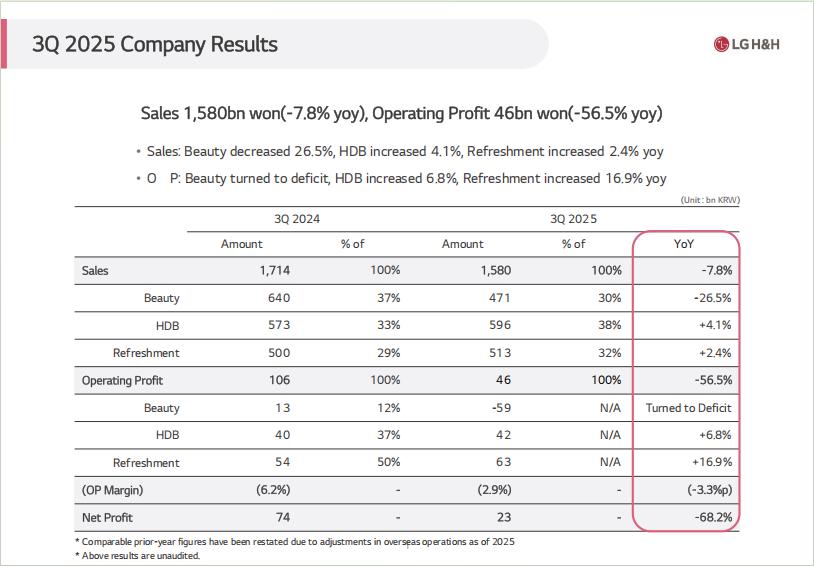 据财报信息,2025年前三季度,LG生活健康实现销售额48830亿韩元(约合人民币234.38亿元),同比下降6.1%,营业利润2430亿韩元(约合人民币11.66亿元),同比下滑41.4%。
