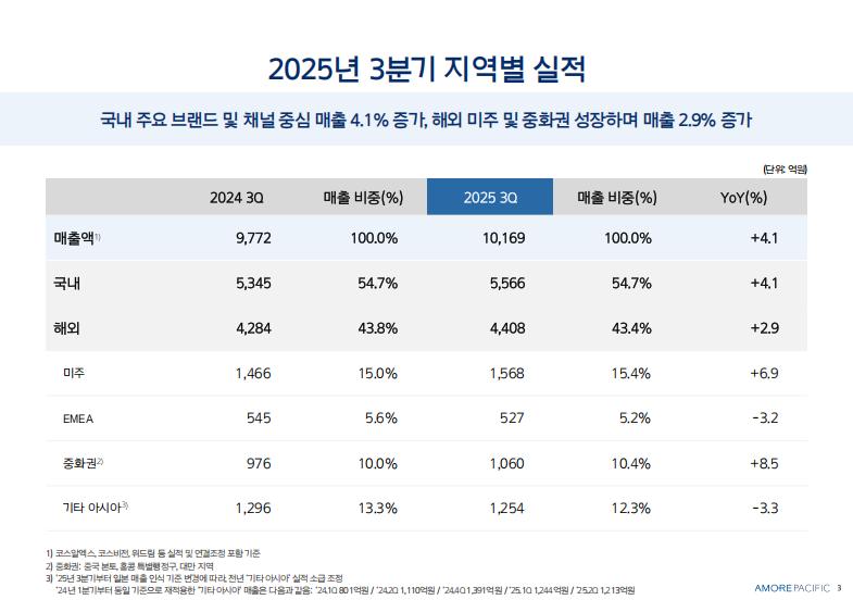 值得注意的是,这次韩妆热潮的中心已不再是中国。有报道称,2025年上半年,韩妆对华出口额占比首次跌破20%。而爱茉莉太平洋和LG生活健康两大韩妆巨头的最新财报也显示,2025年第三季度,中国区销售额占比均已降至10%左右。
