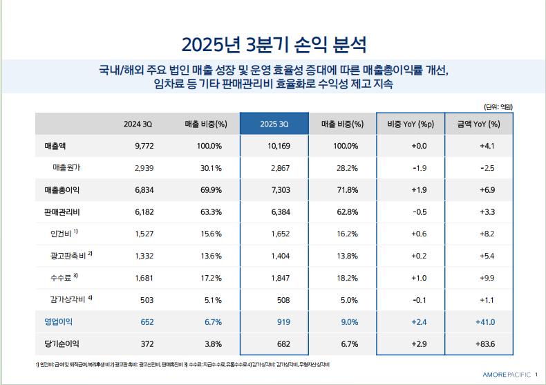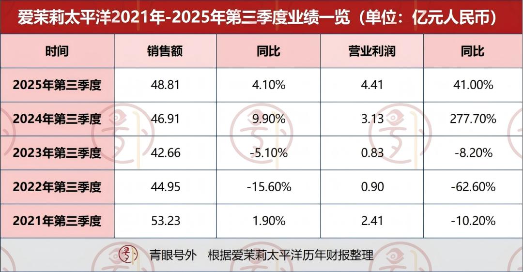 2025年,复苏势头进一步巩固。据财报信息,爱茉莉太平洋第三季度销售额达10169亿韩元(约合人民币48.81亿元),同比增长4.1%;营业利润919亿韩元(约合人民币4.41亿元),同比大幅增长41%;当期净利润更是飙升83.6%至682亿韩元(约合人民币3.27亿元)。