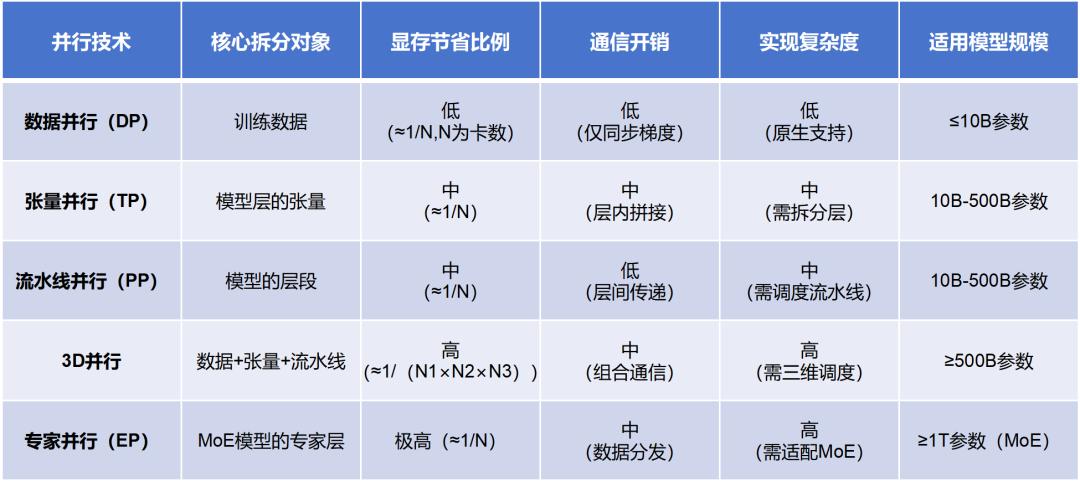 更高级的,是3D并行,通过“数据并行+张量并行+流水线并行”,实现三重拆分,是超大模型训练的主流方案。