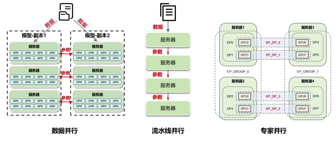AI训练使用的并行,总的来说,分为数据并行和模型并行两类。刚才说的PP(流水线并行)、TP(张量并行)和EP(专家并行),都属于模型并行,待会再介绍。