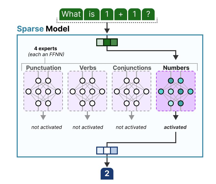 专家层的每个专家负责处理特定类型的token(如语法、语义相关)。路由网络根据输入token的特征,选择少数专家处理这个token,其他专家不激活。