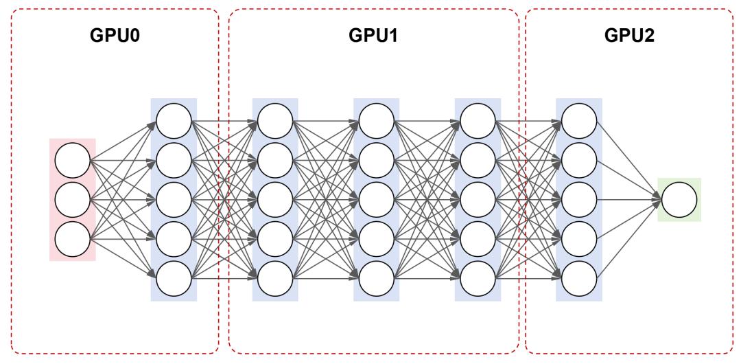 例如,对于一个包含7层的神经网络,将1~2层放在第一个GPU上,3~5层放在第二个GPU上,6~7层放在第三个GPU上。训练时,数据按照顺序,在不同的GPU上进行处理。