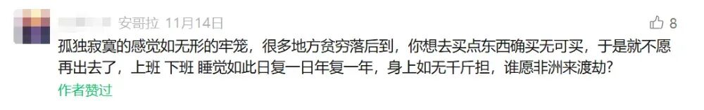 非洲的孤独,和国内两点一线、鲜少社交的上班族不一样:不是无聊,而是找不到一个人说话、更没人共鸣的空虚感,是远在异国他乡,如同扁舟之于苍茫大海的惶恐感。