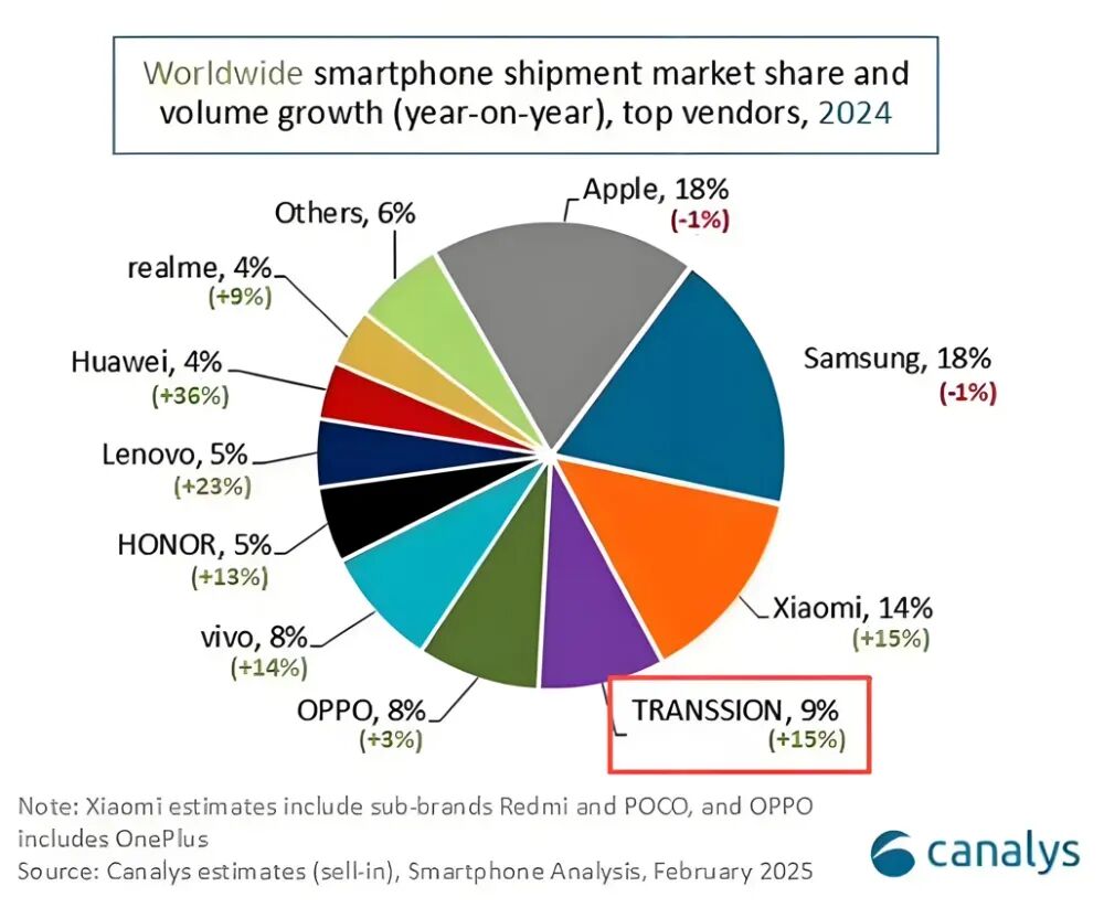 得益于非洲市场的贡献,2024年全球智能手机出货量排名,传音跃居第四