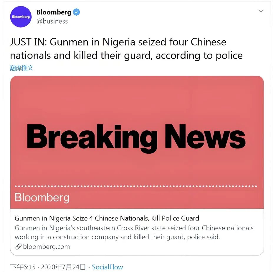 彭博社的一则报道:持枪歹徒劫持了一家建筑公司的4名中国工人,并杀害了安保人员