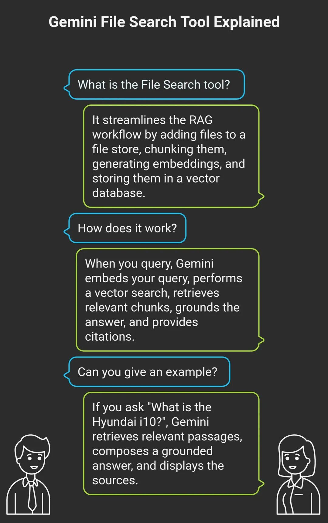 Gemini File Search工作流程:上传文件→自动生成embedding→调用Gemini检索并生成答案→输出含引用结果