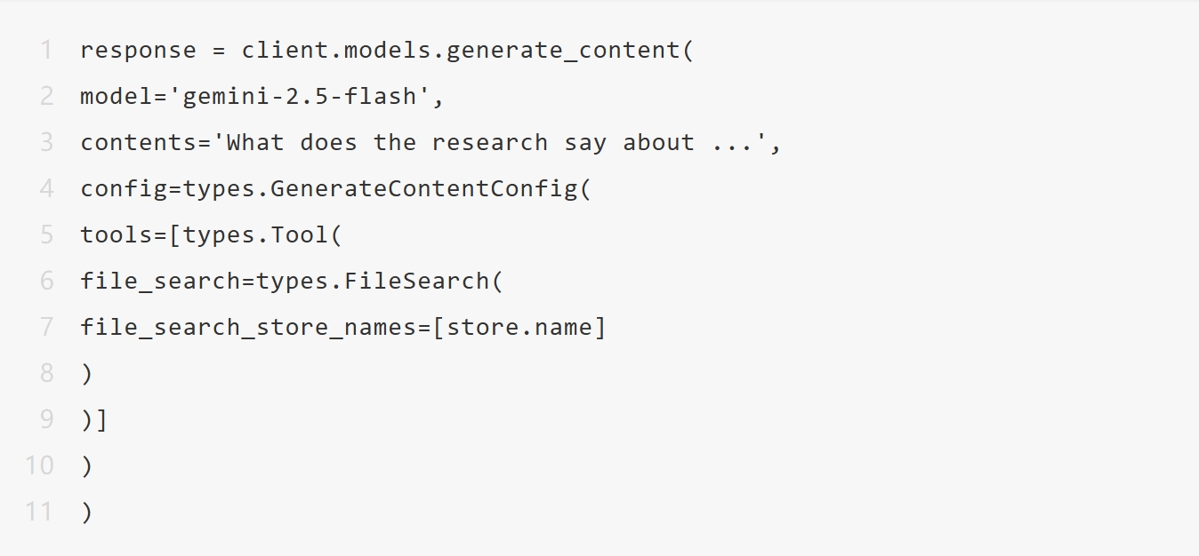 上传文件,系统自动完成分块、embedding与索引;提问时,调用同一个generateContent接口即可,Gemini会在内部完成语义检索与上下文注入,并在回答中自动生成引用。