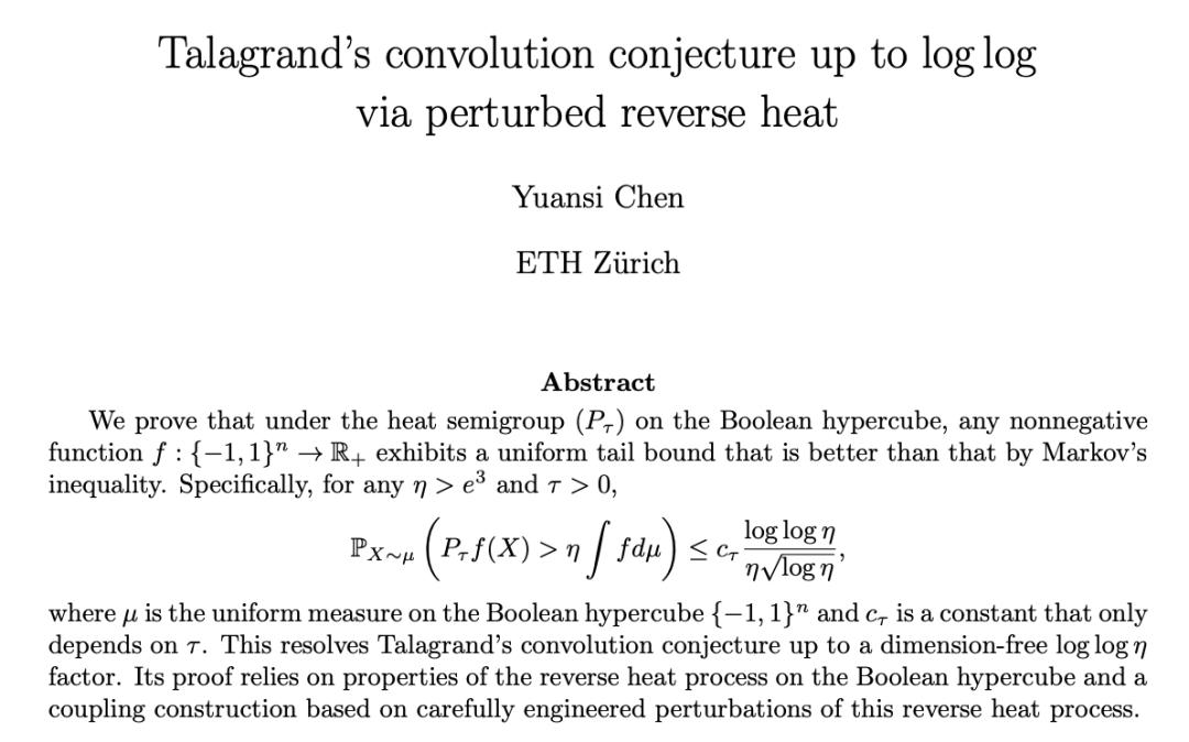 论文证明了布尔超立方体上的塔 拉格兰卷积猜想(Talagrand’s convolution conjecture),结果精确到一个log log η因子。