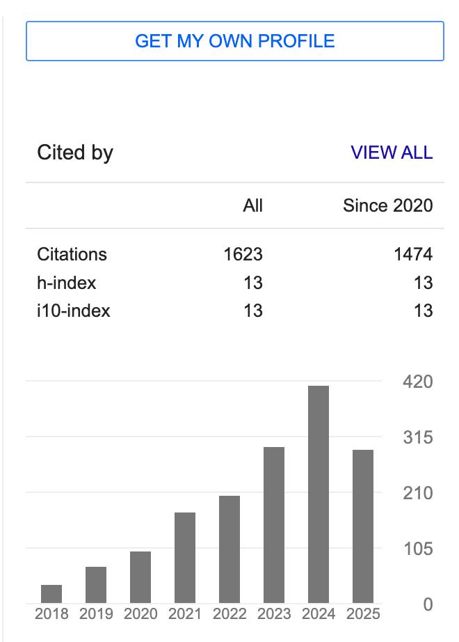 Google Scholar显示,他的论文被引数为1623,h-index为13。