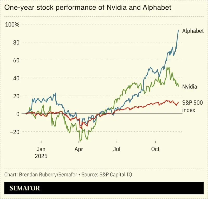 根据金融数据服务商S&P Capital IQ的数据,今年1月至11月期间,谷歌母公司Alphabet与英伟达的股价表现均大幅跑赢标普500大盘。
