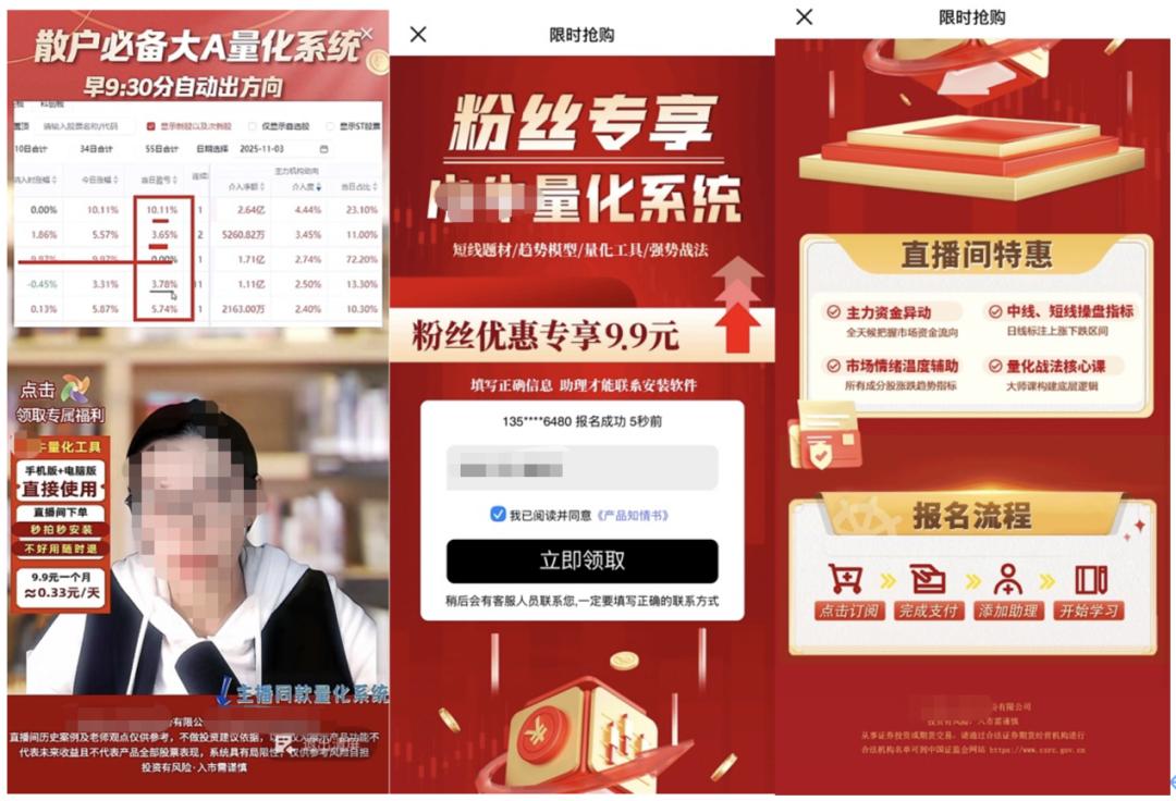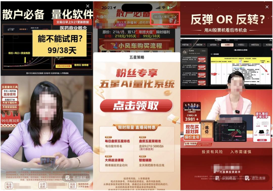 “低位+风口+资金抱团,散户必备五星量化工具!”“双12年终大促,218元用105天,盘前9:27分5000选6,精准捕捉牛股!”打开抖音,此类极具诱惑力的直播宣传扑面而来。