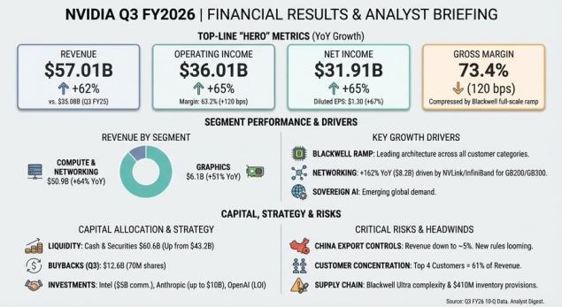 读取英伟达Q3财报PDF,提取营收、毛利率、同比增长、主要营收来源、风险提示,生成一页信息图:左侧大图展示营收趋势折线,右侧罗列5条要点并配简图标,底部给出一行“结论(一句话)”。