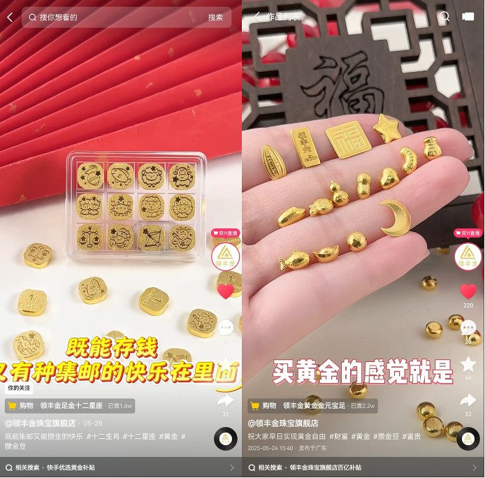 此次快手双11,领丰金进一步强化全域布局,在短视频场域,通过“工厂溯源”等优质内容,配合“囤点黄金”等年轻化素材激发消费需求,为直播间强势引流;在直播场域,每日直播超12小时,叠加红包等互动工具提升用户粘性,并借助平台大额补贴打造爆款价格优势;在货架场域,以1克金豆等小克重产品降低消费门槛,再通过萌趣金豆、星座套组等差异化产品矩阵激发用户复购,形成“试水-养成-囤金”的消费闭环,最终实现单日GMV近2亿元。