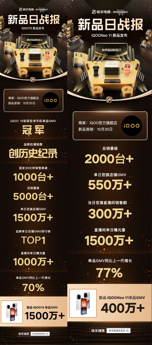 基于此,iQOO 15快手首销大场,新品开售30分钟销量突破1000台,新品GMV超1500万,同比上一代增长70%,斩获安卓手机单品GMV冠军,品牌自播销售创历史纪录,登上品牌单日自播GMV排行榜 TOP1;iQOO Neo 11快手首销大场,新品单品GMV破400万,同比上一代增长77%,单日官旗店铺GMV超550万。