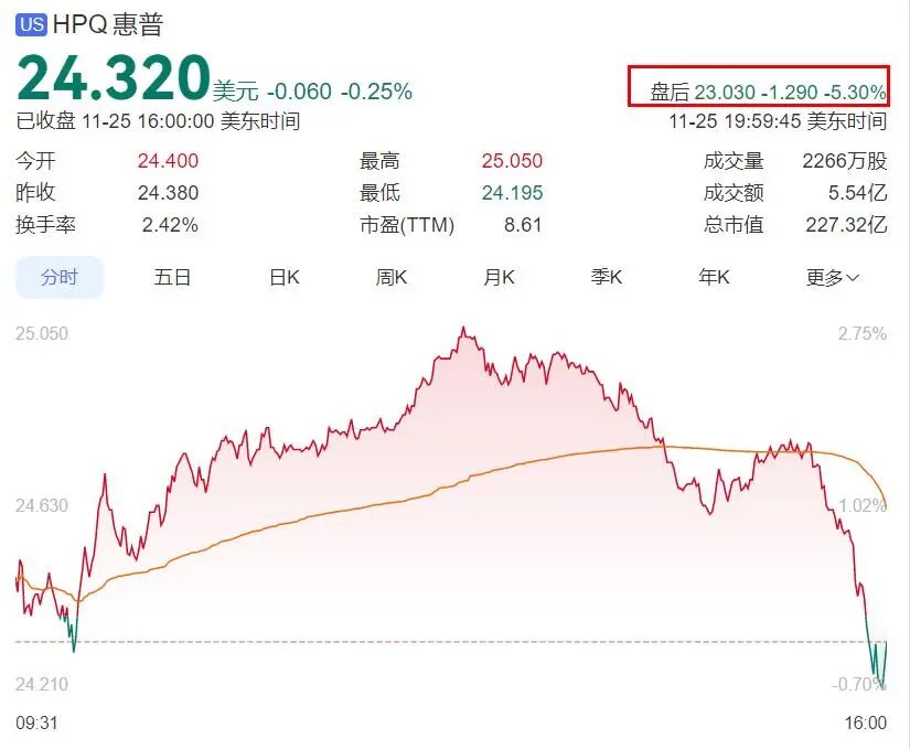 11月26日上午,多家媒体援引彭博社、路透社等全球性媒体报道称,惠普公司当地时间周二宣布,将通过更多地使用AI工具,在2028财年之前裁员4000至6000人,从而每年节省约10亿美元。受相关消息影响,惠普美股盘后一度跌超7%,截至11月25日美股收盘,惠股跌超5%。