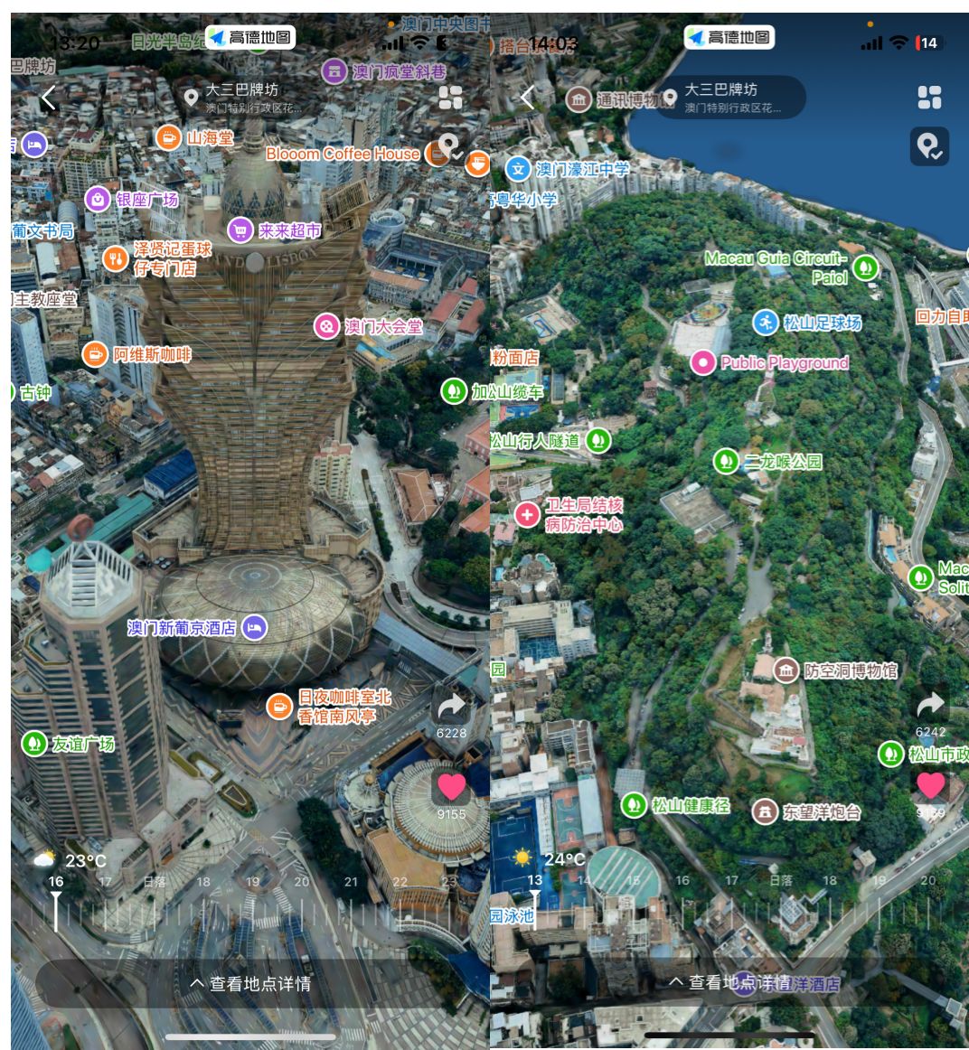 在出发前,游客可通过“一键智慧游澳门”中的奇境Max,在手机上以360度视角沉浸式鸟瞰澳门特区全貌。在空间智能技术的加持下,高德为澳门全域建立了生动逼真、美轮美奂的数字孪生模型。大三巴的古朴、澳门塔的开阔,酒店和官也街之间的距离远近,都可以在奇境Max中直观地看到,方便游客的出行和决策。