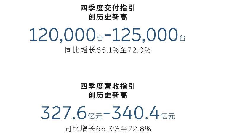 决战的四季度,蔚来给出了更激进的目标:预计交付量将在12万至12.5万台之间,同比增长65.1%至72.0%,再创纪录;营收预计在327.6亿元至340.4亿元之间,同比增长66.3%至72.8%。