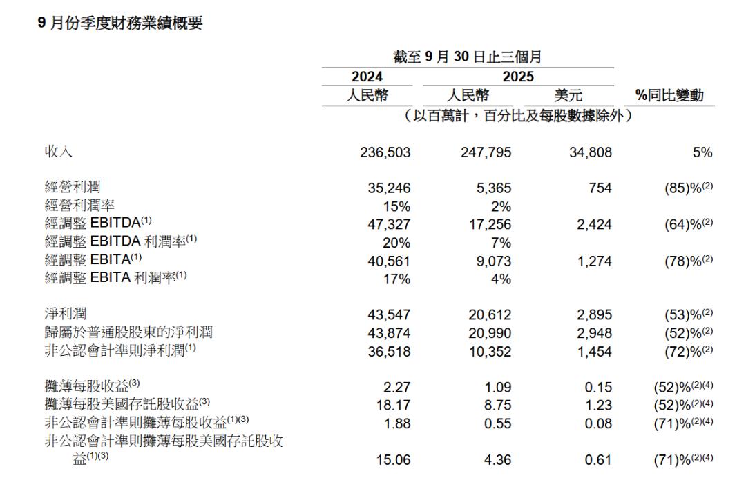 11月25日,阿里巴巴发布了2025年第三季度(2026财年第二财季)业绩,有赖于云业务、核心电商业务的贡献,总营收为2477.95亿元,同比增长5%;如果不考虑剥离高鑫零售和银泰对收入的影响,则同比增长15%。
