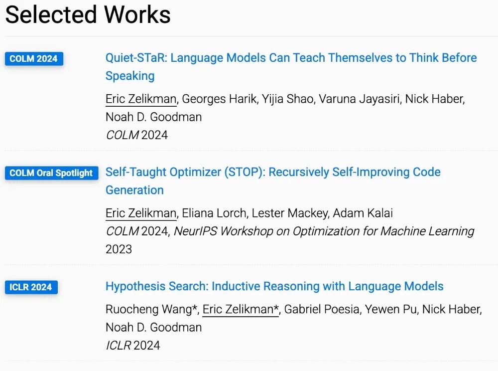 ▲泽利克曼的论文成果节选(来源:Eric Zelikman个人网站)