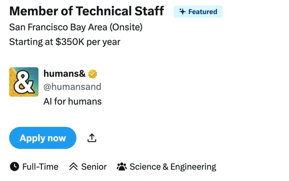 目前,Humans&的技术团队还在招募中,从其推特主页中挂着的技术人员的招聘信息中得知,泽利克曼给技术人员开出了最低35万美元(约合人民币248万元)的年薪,办公地为美国旧金山湾区。