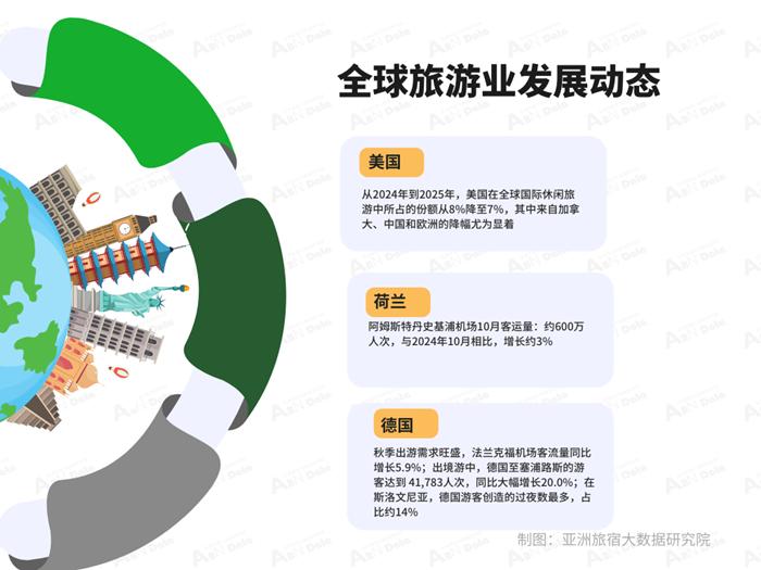 荷兰方面, 10月旅游市场增速明显。旅游市场的核心驱动力来自于文化活动和高效的航空枢纽。阿姆斯特丹史基浦机场10月客运量:约600万人次,与2024年10月相比,增长约3%。作为欧洲第三大航空枢纽,史基浦机场的客运量是衡量荷兰入境旅游流量的最关键指标。3%的稳定增长表明荷兰,尤其是阿姆斯特丹大区的入境旅游需求在10月保持健康增长。从史基浦机场入境的数据来看,来自北美,特别是美国的旅客流量持续领先,是增长的主要贡献者之一。荷兰作为美国游客进入欧洲的门户地位依然稳固。此外,“城市文化月”效应:10月的阿姆斯特丹是文化活动的旺季。博物馆、安妮之家等景点游客络绎不绝。同时,“阿姆斯特丹舞蹈节” 通常在10月举行,这一全球知名的电子音乐盛会吸引了大量国际年轻游客和专业人士,显著推高了当月的航空和酒店需求。
