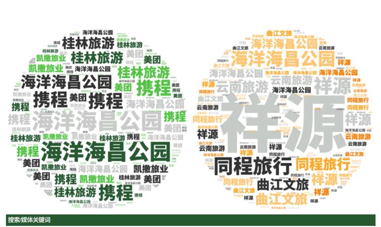 搜索指数|搜索热度TOP5,分别是海洋海昌公园、携程、桂林旅游、美团、凯撒旅业,搜索热度攀升主要集中在人事任免,文旅项目开业签约、头部旅企股权变动等三大层面。如海昌海洋公园詹新伟被聘为首席财务官兼副总裁;桂林旅游拟挂牌转让资江丹霞100%股权及债权;凯撒旅业完成收购青岛汉莎天厨食品公司等一度登上垂直搜索热度第一。