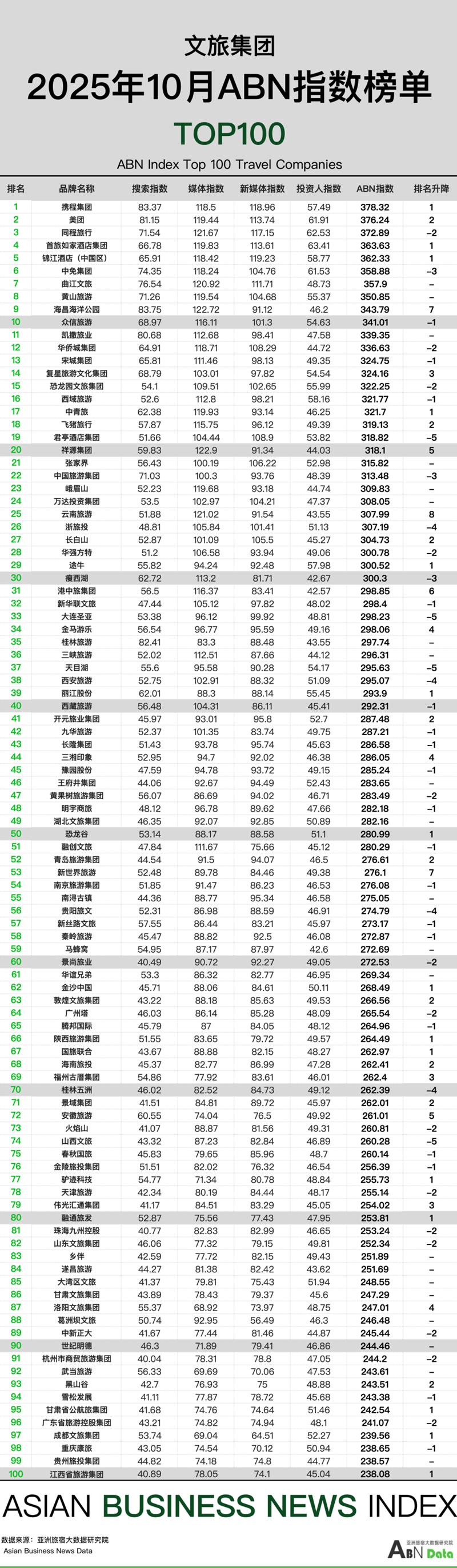 综述|2025年10月,文旅企业的媒体指数和新媒体指数稳中略升,监测均分达到118.4,117.86,投资人指数保持平稳。