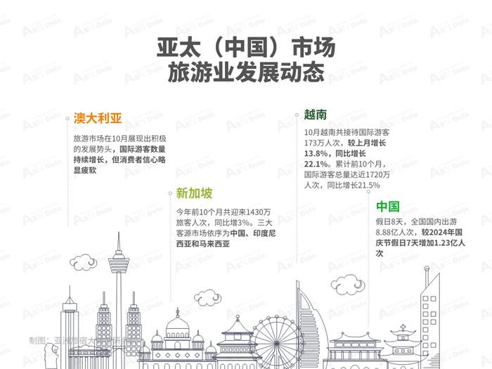 澳大利亚方面,根据亚洲旅宿大数据研究院监测的10月数据,澳大利亚旅游市场在10月展现出积极的发展势头,国际游客数量持续增长,但消费者信心略显疲软。同时,近期发生的中国公民登山事故也为旅行安全敲响了警钟。10月份,澳大利亚凭借其标志性的文化和体育赛事,成功吸引了全球目光和大量游客。停办多年的“永远的好朋友” 大型音乐节在10月成功重启。这一音乐盛事吸引了包括泰勒·斯威夫特在内的国际顶级巨星参演,不仅引爆了本土票房,更吸引了大量跨州乃至国际乐迷前往主办地,极大地拉动了当地酒店、餐饮和交通的消费。体育赛事吸引全球游客:10月,澳大利亚举办了多项国际级体育赛事,例如在维多利亚州吉朗举行的世界自行车锦标赛。这类大型体育事件不仅带来了直接的参赛者和观赛游客,也通过媒体转播提升了举办城市的国际知名度,对旅游业产生了长效影响。