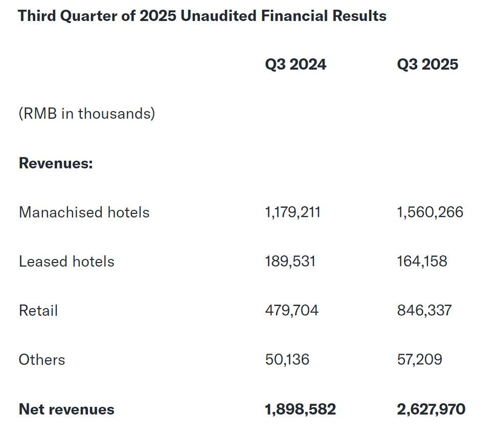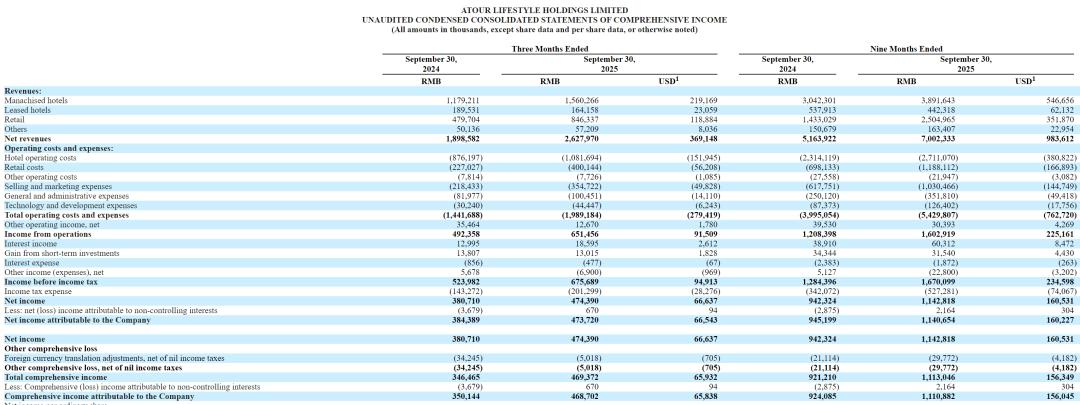 亚朵2025年第三季度净利为4.74亿元(约6700万美元),较上年同期的3.81亿元增长24.6%;经调整净利为4.88亿元(约6900万美元),较上年同期的3.84亿元增长27%。