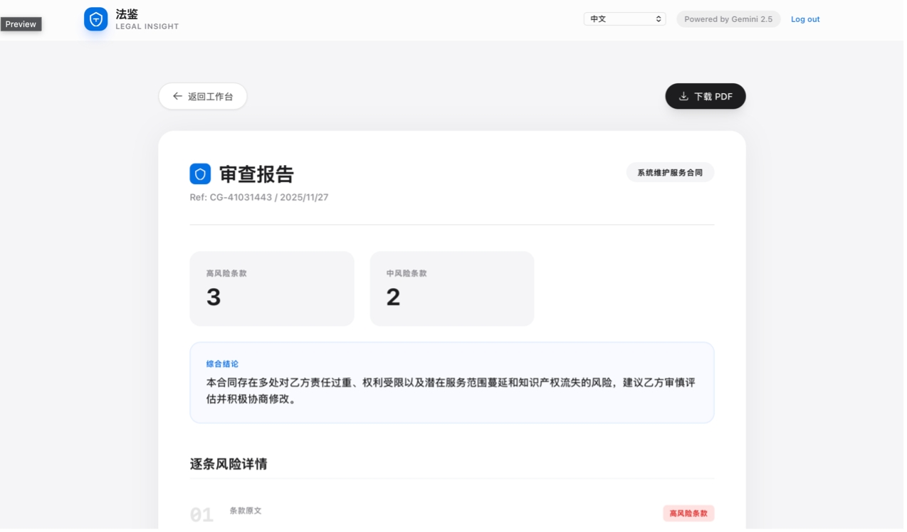 产品层面:核心价值在于“可信赖的修订方案”。AI规划引擎能对 Word、PDF 甚至扫描件进行高精度解析;平台提供的风险报告集成了逐条风险分析和专业的修订条款草案,将复杂的合同问题转化为高效、有序、可执行的修正指令,彻底解决创业者“知道有风险,但不知如何修补”的难题。