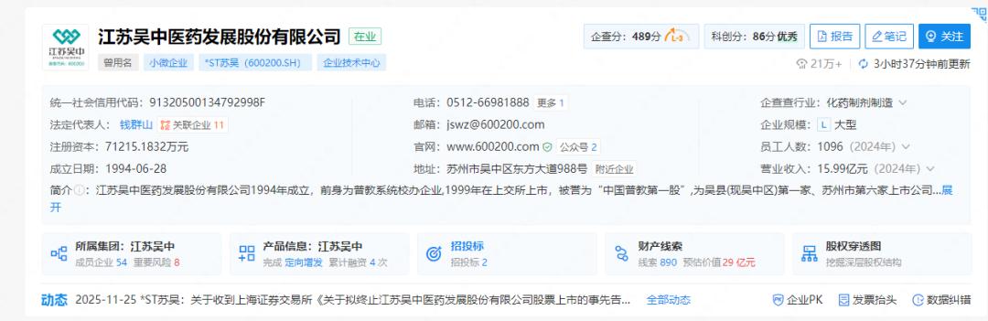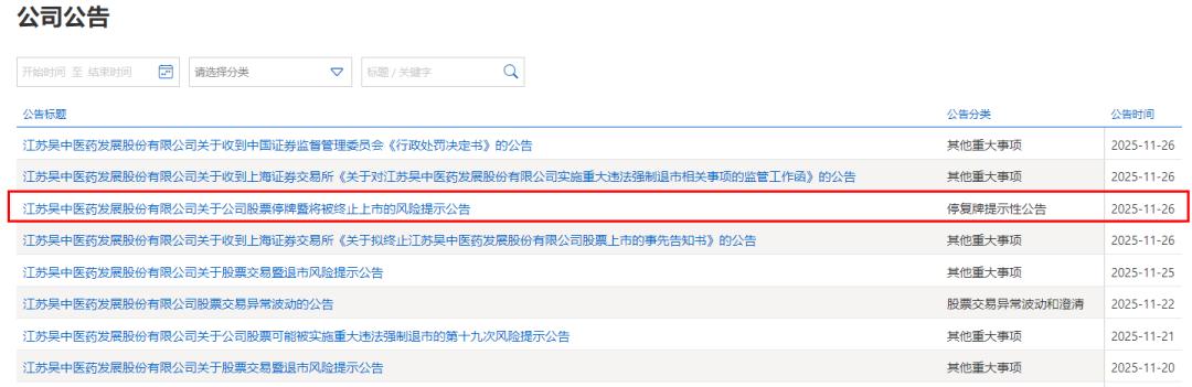 11月26日,江苏吴中(股票代码:600200)在上海证券交易所(下文称“上交所”)发布多个公告,事关停牌及将被终止上市的风险提示。