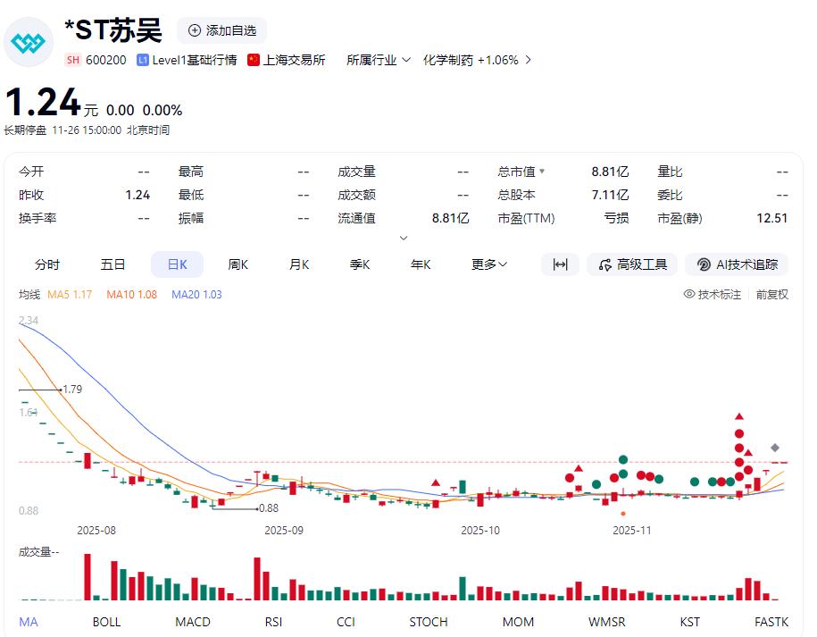 在上述一系列负面信息下,江苏吴中的股价持续走低,昨日(11月25日)收盘价仅为1.24元/股。