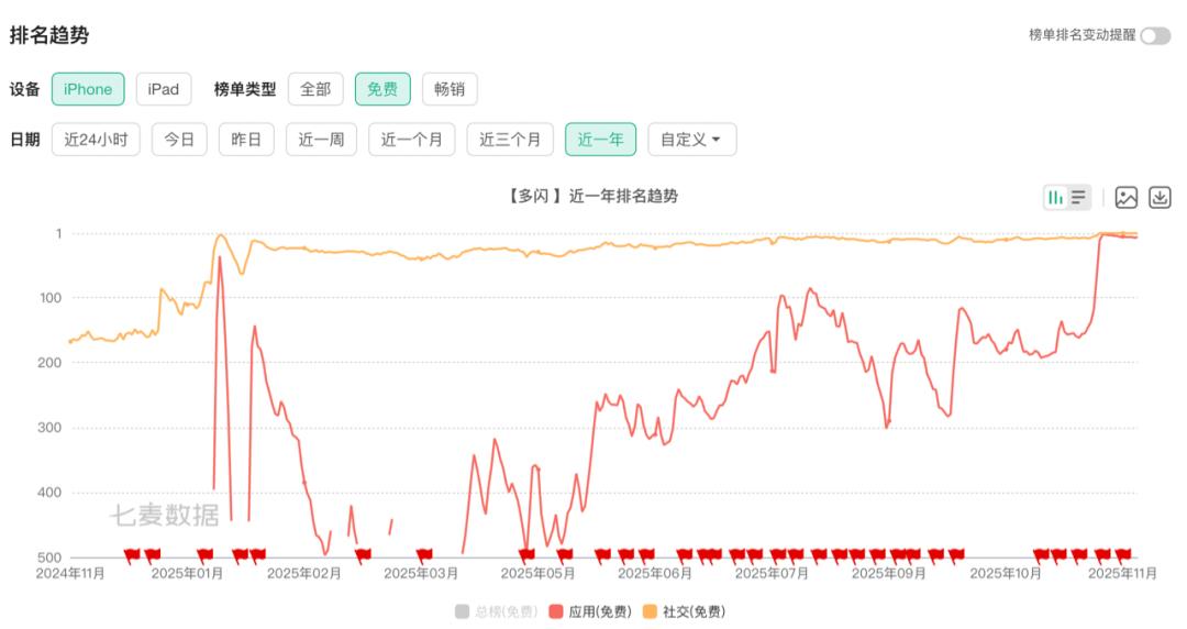 在App Store免费总榜上,在年初的骤起骤落之后,多闪一直在百名之外起起伏伏,直到11月连续三个版本更新才终于一跃而起,直接升至10名之内,与豆包、红果短剧、汽水音乐、抖音商城等“字节系”应用合力形成霸榜之势。