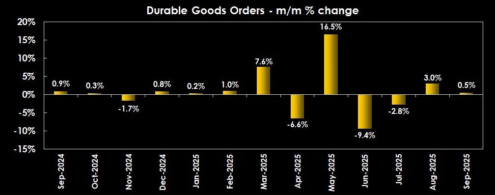 美股涨太多就回调,跌多了就反弹,无需太多理由,盘前,美国公布的 9 月耐用品订单环比增长 0.5%,高于市场预期的 0.3%;其中剔除运输项目的核心耐用品订单录得 0.6% 的环比增速,不仅高于预期,也好于前值。这表明企业资本开支仍在维持,对判断美国经济能否软着陆具有关键意义。