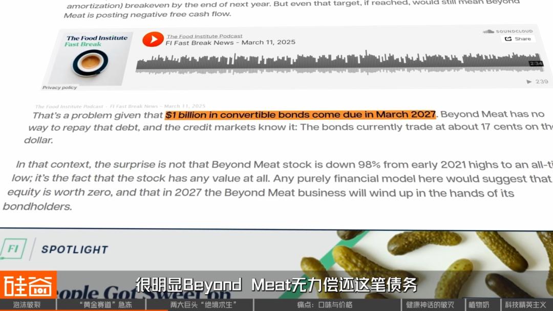 还有一个更致命的地方:公司账上有10亿美金的可转换债券,将在2027年3月到期。很明显,Beyond Meat无法偿还这笔债务,信贷市场也知道这一点,这些债券目前的交易价格仅仅是面值的17%。用华尔街的语言翻译过来就是:市场认为Beyond Meat大概率还不上这笔钱,它在两年内违约的概率,几乎是板上钉钉。