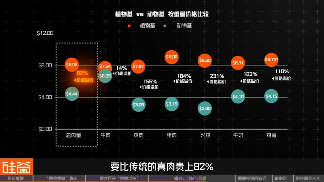 总体来说,植物肉的平均价格,要比传统的真肉贵上82%,几乎要翻一倍。