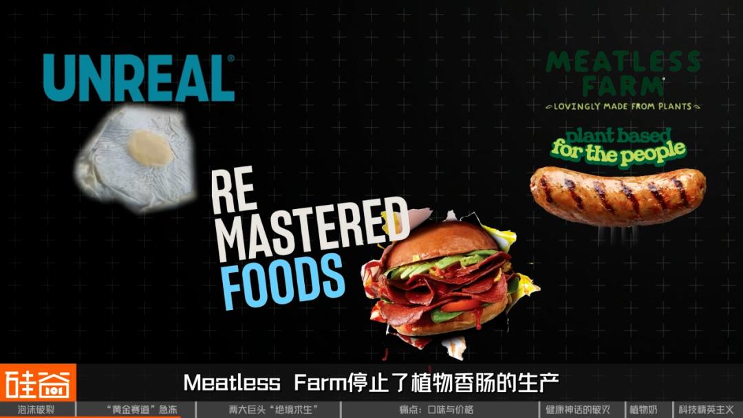 所以结局就是:资本撤退,消费者态度转向,直接导致了行业经历了一场残酷的“大洗牌”。UNREAL Foods放弃了研发无蛋鸡蛋,Remastered Foods停止了素培根,Meatless Farm停止了植物香肠的生产……越来越多的替代蛋白公司纷纷倒闭、裁员或被出售。