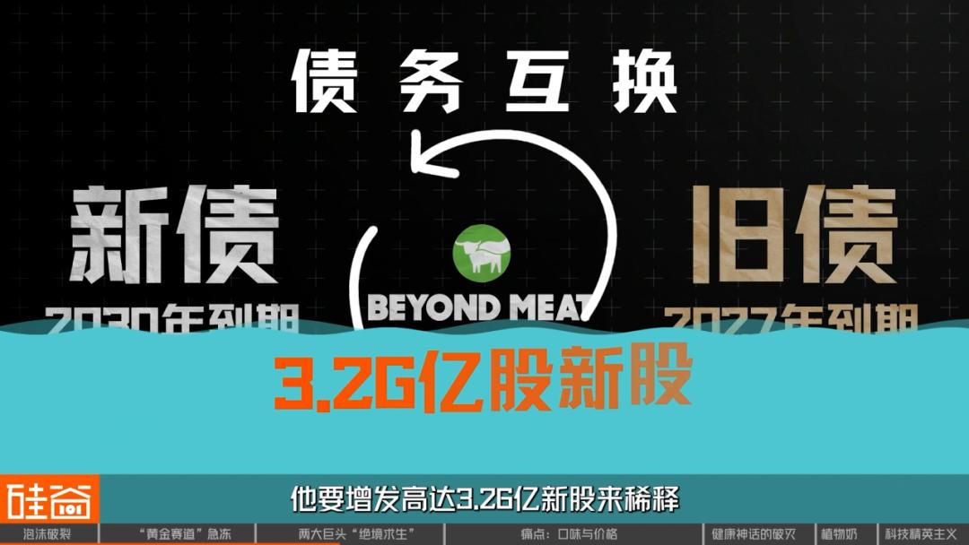 事情是这样的:10月初,Beyond Meat为了解决债务问题,搞了一个“债务互换”。简单说,就是用2030年到期的新债,换2027年到期的旧债。但代价是什么呢?它要增发高达3.26亿股新股来稀释。要知道,它当时的总股本才7600万股。这就相当于往一小杯威士忌里,倒进去了一整大瓶水。