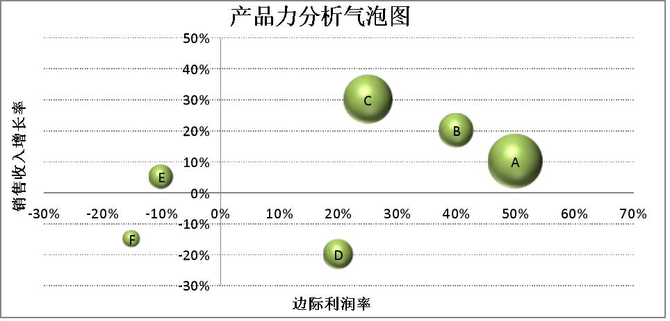 以边际利润率为横轴,代表盈利能力;以销售收入增长率为纵轴,代表发展速度;以气泡大小代表该SKU的销售收入规模。