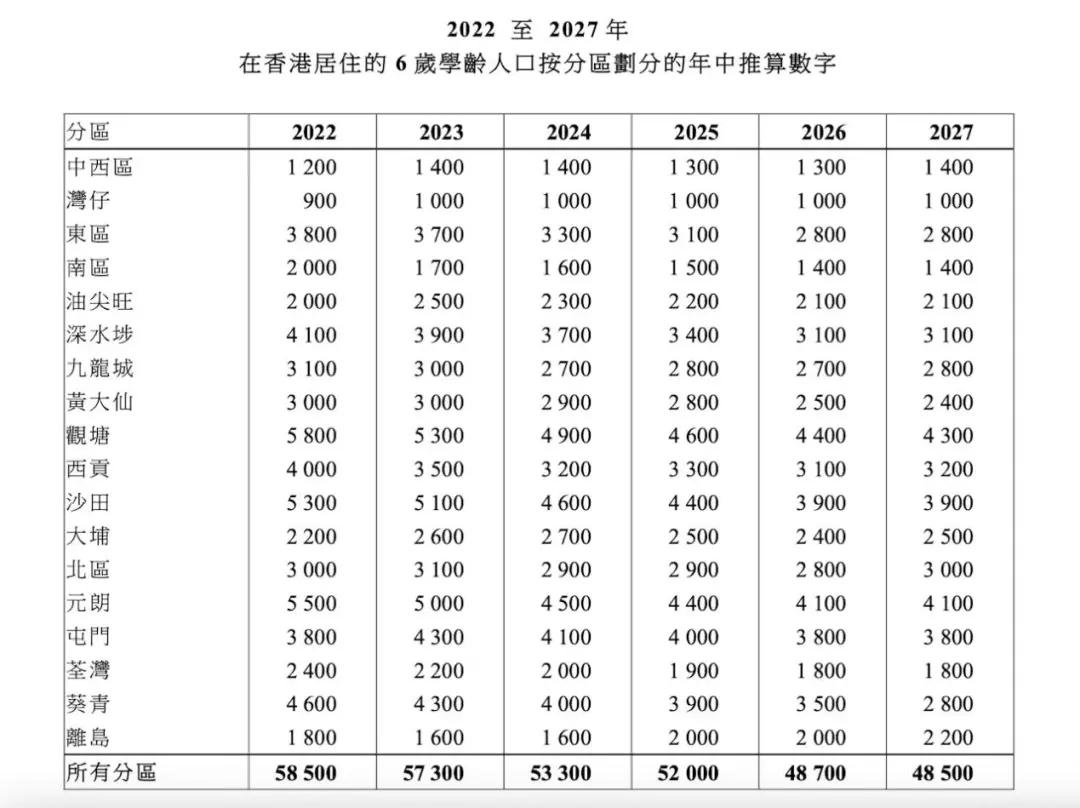 香港特区政府此前预估的当地六岁学龄人口推算数字。图源:香港特区政府统计资料