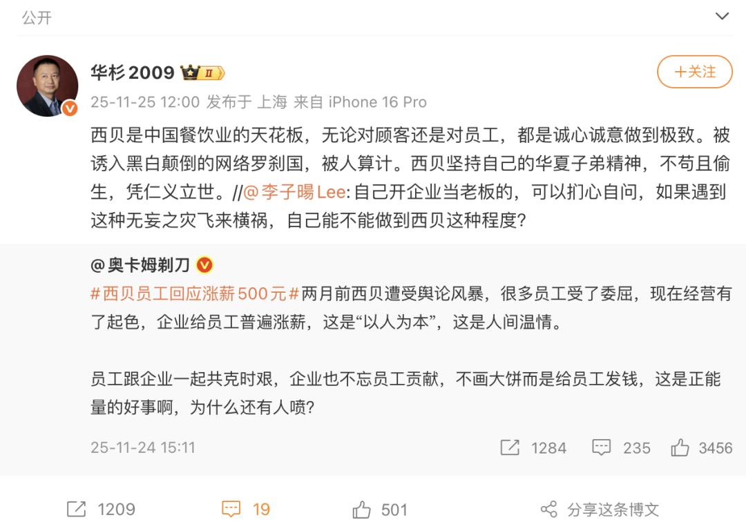 11月25日,华杉转发了关于西贝员工回应涨薪的微博,并发文称:“西贝是中国餐饮业的天花板,无论对顾客还是对员工,都是诚心诚意做到极致。被诱入黑白颠倒的网络罗刹国,被人算计。西贝坚持自己的华夏子弟精神,不苟且偷生,凭仁义立世。”