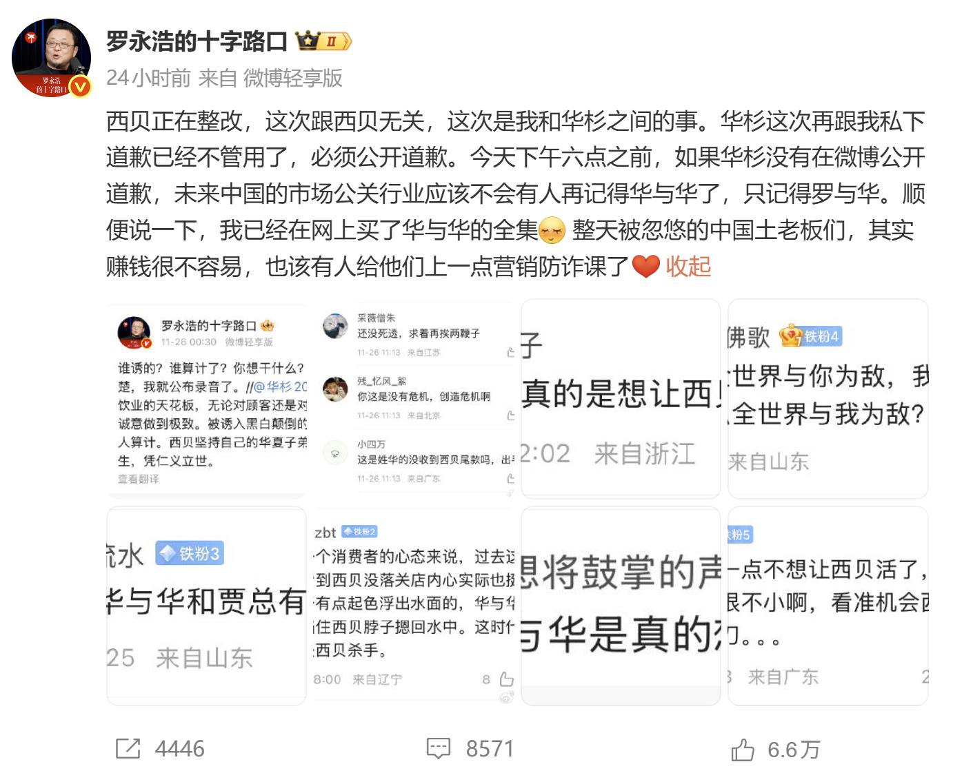 而在11月25日,西贝品牌顾问、华与华创始人华杉发文称,“西贝是中国餐饮业的天花板,无论对顾客还是对员工,都是诚心诚意做到极致。被诱入黑白颠倒的网络罗刹国,被人算计。西贝坚持自己的华夏子弟精神,不苟且偷生,凭仁义立世。”对此,26日凌晨罗永浩转发并回应:“谁诱的?谁算计了?你想干什么?你要是说不清楚,我就公布录音了。”