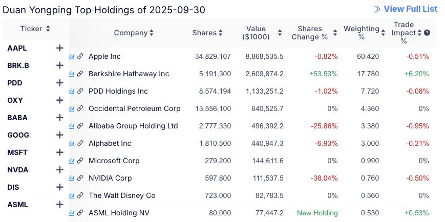 在第三季度,段永平加仓伯克希尔·哈撒韦,“新晋”光刻机巨头阿斯麦。从减持情况来看,段永平对阿里巴巴和英伟达明显减仓,减持幅度超过25%。此外,他还小幅减持了苹果、拼多多、谷歌。具体来看: