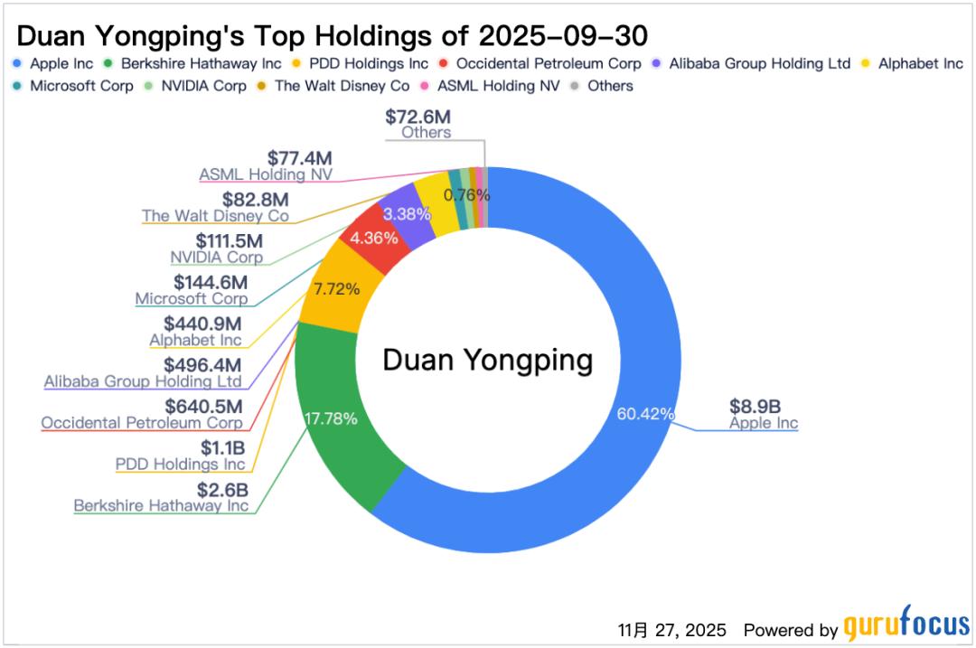 在所有与段永平相关的机构中,H&H International Investment(以下简称“H&H”)是目前唯一能够通过美国13F文件公开追踪其投资动向的管理账户。截至2025年1月29日,其管理资产规模(AUM)已达到219亿美元。随着2025年三季度最新持仓披露,这位传奇投资人的千亿级投资版图也随之浮出水面。
