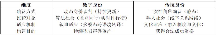 身份首先回答“我是谁”,继而通过社会结构获得群体资格。随着互联网的发展,身份开始延伸到数字空间。美国心理学家和计算机科学家雪莉·特克尔(Sherry Turkle)在《第二自我:计算机与人类精神》一书中提出,数字化环境使人可以在虚拟空间塑造“第二自我”,由此衍生出数字身份的概念。数字身份指个体在网络空间中所有自我呈现与数据痕迹总和,会随着创业阶段、制度语境与算法反馈而动态变化。数字身份与传统身份管理对比详见表1。