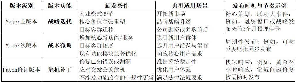 另一方面,可引入软件工程中的“版本迭代”思维进行身份管理,即将身份视为可迭代产品,采用语义化版本规则(vMajor.Minor.Patch)标识:Patch版本随时修复漏洞,Minor版本用于战术微调,Major版本对应战略迭代升级。版本号公开透明,使更新节奏、内容语义和发布时机与外部预期对齐,从而实现身份管理的可视化、可控性与易沟通性(示例见表5)。