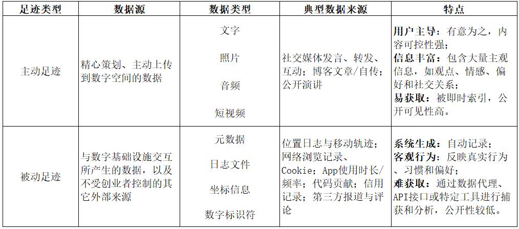 数字足迹是数字身份建构的底层数据,即创业者在数字空间留下的、保存在服务器端的全部痕迹,按照数据产生方式可分为主动足迹与被动足迹(详见表2)。主动足迹是创业者有意识的自我呈现,例如在社交媒体分享创业历程、在专业平台发布行业见解等。被动足迹则是创业者与数字基础设施交互时产生的,以及不受其完全控制的数据,包含信用记录、网络浏览历史、代码贡献、媒体报道,以及算法生成的评分或行为偏好分析等。