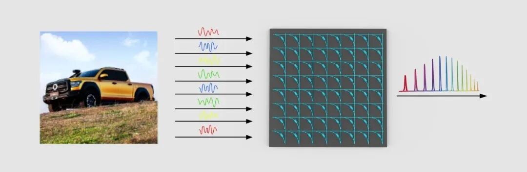 如下图所示,图像信息通过光的折射将不同频率的光信号直接输入到光计算芯片内部,经过不同计算光路上的调制和耦合,即可完成压缩,实现无额外能量消耗的计算。此外,光本位科技特有的存算一体架构可以使其光计算引擎在处理批量任务时保持“零静态维持功耗”。